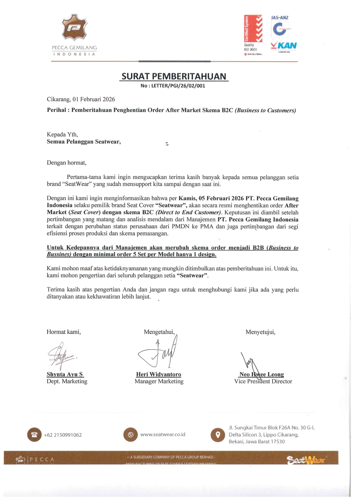 Perubahan skema after market PT.PECCA GEMILANG INDONESIA dengan brand seatwear dari B2C to B2B,